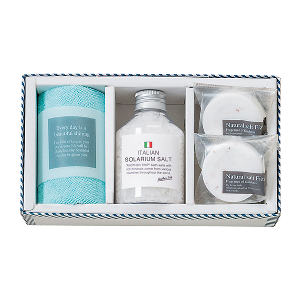 「もう一つの旅」をコンセプトに、世界の国々から集めた大自然の恵みいっぱいのバスソルトとマイクロファイバークロス、ソルト・フィズを詰め合わせました。毎日のゆったり癒やしのバスタイムが楽しみに。