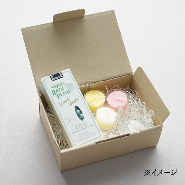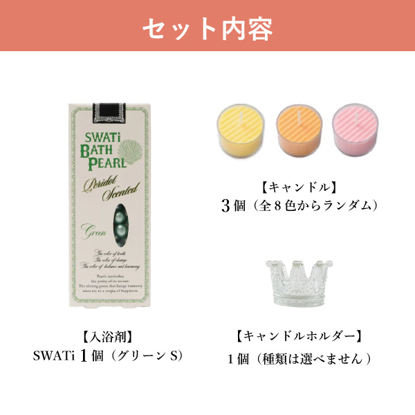 | 内容 | 【SWATi】 入浴剤 -BATH PEARL- GREEN (S)×1 【カラーキャンドル】 キャンドル アソート×3 ※色はお選びいただけません 【キャンドルホルダー】 キャンドルホルダー×1 ※デザインはお選びいただけません |