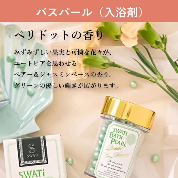 香りも新たに、ユートピアを思わせる『ペリドット(ペアー&ジャスミンベース)』の香りとグリーンの優しい輝きが広がる、あなただけの特別なバスタイムをお楽しみください。