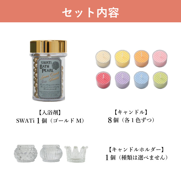 | 内容 | 【SWATi】 入浴剤 -BATH PEARL- GOLD (M)×1 【カラーキャンドル】 キャンドル×8(各1色ずつ) 【キャンドルホルダー】 キャンドルホルダー×1 ※デザインはお選びいただけません |