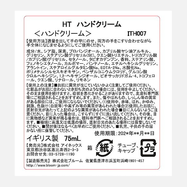 | 材質 | 成分/水、シア脂、尿素、プロパンジオール、カプリル酸ヤシ油アルキル、グリセリン、ステアリン酸グリセリル(SE)、クエン酸トリエチル、トリ(カプリル酸/カプリン酸)グリセリル、セタノール、タピオカデンプン、香料、ステアリン酸、フェノキシエタノール、カルボマー、パンテノール、エチルヘキシルグリセリン、アラントイン、ステアロイルグルタミン酸Na、EDTA-2Na、水酸化Na、ポリメチルシルセスキオキサン、ベンザルコニウムクロリド、グルコン酸クロルヘキシジン、1,2-ヘキサンジオール、ビオサッカリドガム-4、トコフェロール、クエン酸、リナロール、リモネン |