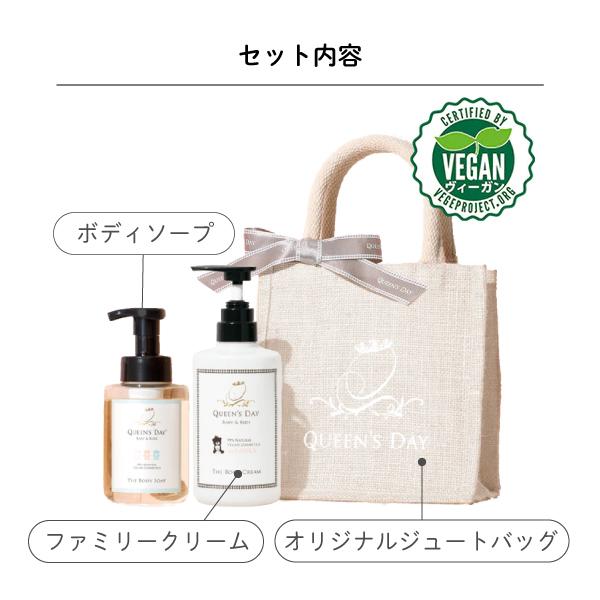 | 内容 | ボディソープ380ml×1 ファミリークリーム500g×1 オリジナルジュートバッグ×1 |