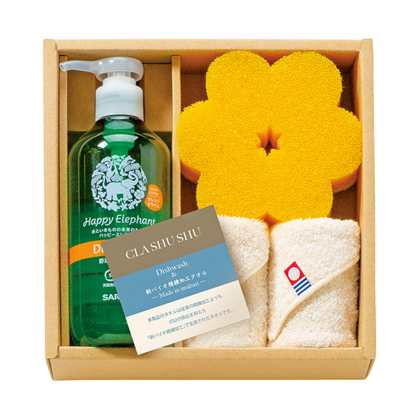 植物と酵母から生まれた未来の洗剤「Happy Elephant」と、従来の精練加工よりCO2排出を削減した無添加のやさしいファブリックのセット。家事を楽しくサポートし、幅広い世代に喜ばれる贈り物です。