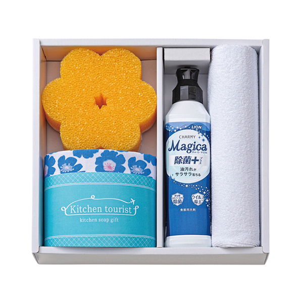ナノ洗浄でベタつく油汚れもサラサラ落とす食器用洗剤・チャーミーマジカと、今治タオルやマイクロファイバークロスがセットになった、役立つキッチン洗剤ギフト。かわいらしい花型のスポンジとチャーミーマジカで食器洗いを楽しくサポートします。