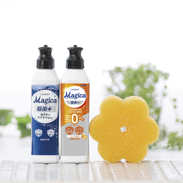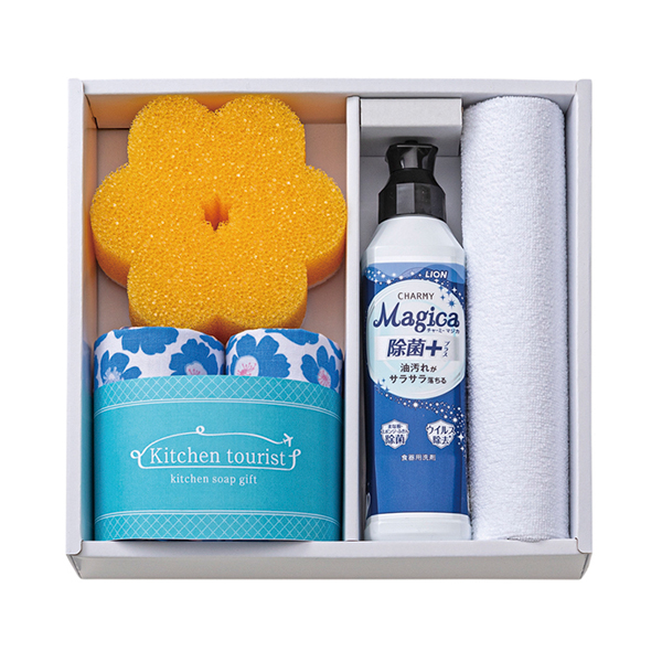 ナノ洗浄でベタつく油汚れもサラサラ落とす食器用洗剤・チャーミーマジカと、今治タオルやマイクロファイバークロスがセットになった、役立つキッチン洗剤ギフト。かわいらしい花型のスポンジとチャーミーマジカで食器洗いを楽しくサポートします。