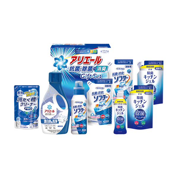 | 内容 | P&Gアリエールジェル700g・除菌キッチンジェル200ml・抗菌消臭ソフターEX350g・液体洗たく槽クリーナーPRO200g×各1、除菌キッチンジェル(詰替)160ml・抗菌消臭ソフターEX(詰替)350g×各2 |