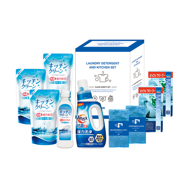 | 内容 | 花王アタック抗菌EX本体750ml・キッチンクリーン250ml×各1、キッチンクリーン詰替200ml×3、メッシュクリーナー・マイクロファイバークロス:20×20cm×各2 |