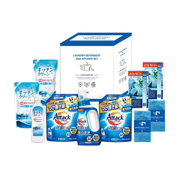 | 内容 | 花王アタック抗菌EX本体750g・キッチンクリーン250ml×各1、花王アタック抗菌EX詰替900g・キッチンクリーン詰替200ml・メッシュクリーナー・マイクロファイバークロス:20×20cm×各2 |