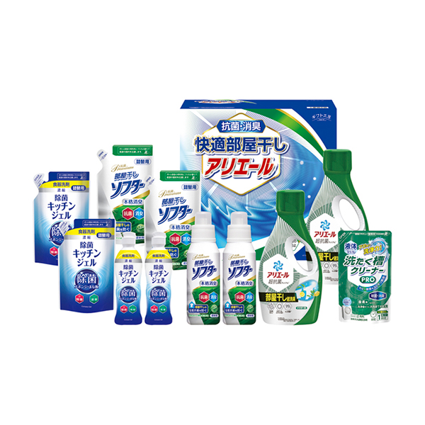 | 内容 | P&Gアリエールジェル部屋干し超消臭700g・除菌キッチンジェル200ml・除菌キッチンジェル(詰替)160ml・抗菌部屋干しソフター300g・抗菌部屋干しソフター(詰替)300g×各2、液体洗たく槽クリーナーPRO200g×1 |
