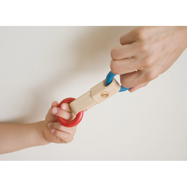 LEGAMEはイタリア語で「絆」の意味。手は「第2の脳」と言われているようにその運動は脳の発達をうながしています。赤ちゃんの握る力でリングを掴み、自分で動かしたり親子で引っぱり合ったりすることで楽しく遊びながら絆を感じることのできるラトルです。