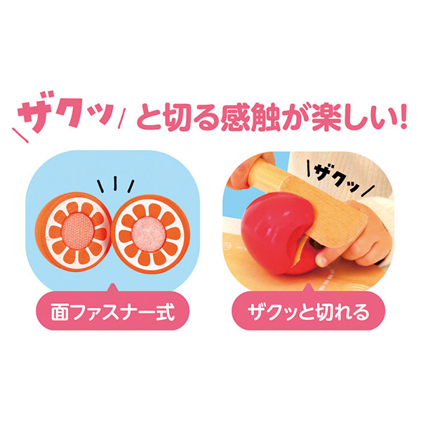 小さいママになりきって、5種類の果物が切れる基本のおままごとセットです。面ファスナーでザクッと切れる音が心地良いリアルなおままごと遊び。しっかり切れる手応えは達成感があって楽しめます。