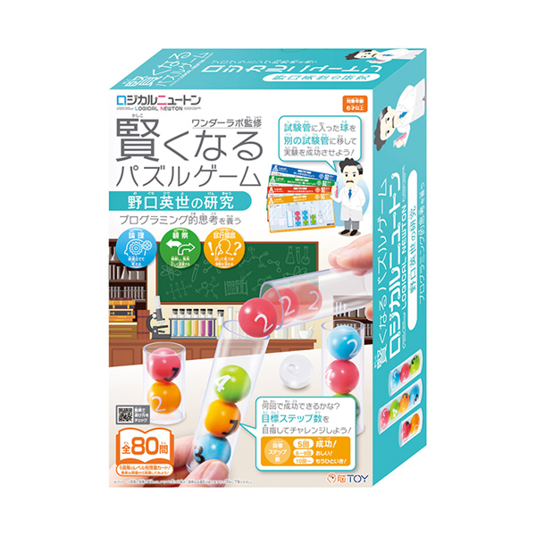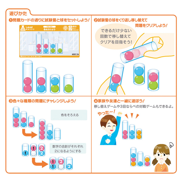 試験管の球をどのように移動させるか考えることで、論理的思考能力を育みます。立体的に考える3目並べなどの対戦ゲームなど3種のゲームもできるので、一人でも家族や友達とも一緒に楽しむことができます。