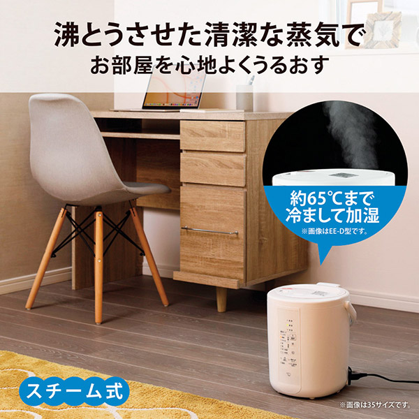 ■清潔な蒸気のスチーム式■お手入れ簡単「フィルター不要」&「広口容器」■トリプル安心設計「チャイルドロック」「ふた開閉ロック」「転倒湯もれ防止構造」■デュアルセンサーが湿度を自動コントロール「自動加湿3段階」