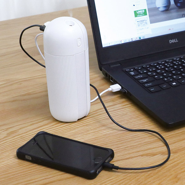 本体充電中はUSBでアウトプットができるので、スマートフォンなどの充電の中継にも使えて便利です。■加湿能力:約30ml/h(±20%)■タンク容量:約250ml■充電時間:約2時間■連続使用可能時間:約2時間
