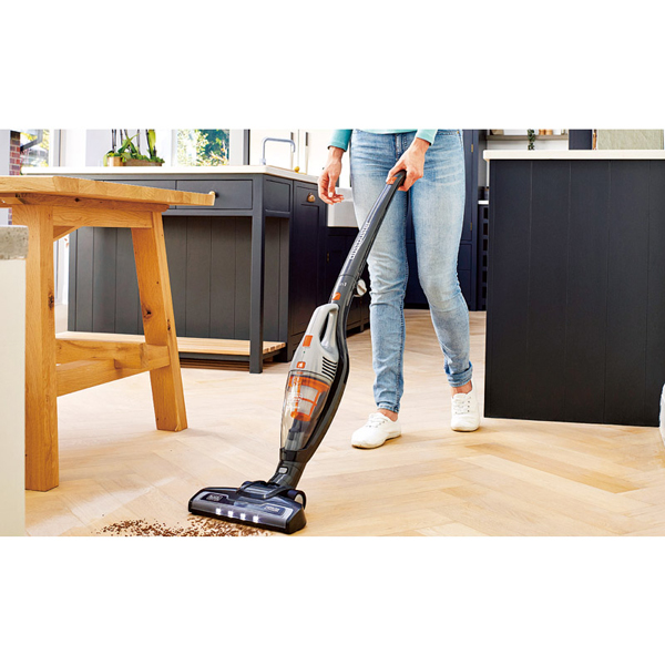パワフルな14.4Vリチウムバッテリーを備えた2in1スティッククリーナー。標準モードで約30分連続使用でき、広いスペースの掃除もスムーズにこなせます。LEDライトで暗所のゴミも見逃しません。ハンドルは折りたためて自立収納が可能。ノズルは本体ポケットに収まり、収納性も抜群。