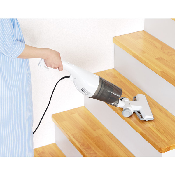 手軽に使えるハンディ兼用の2WAYスティッククリーナー。低重心設計で取り回しが軽く、長時間の掃除でも手元に負担がかかりにくい仕様です。ダストケースは水洗い可能で清潔に保て、自立式のため部屋の省スペースにすっきり収納できます。