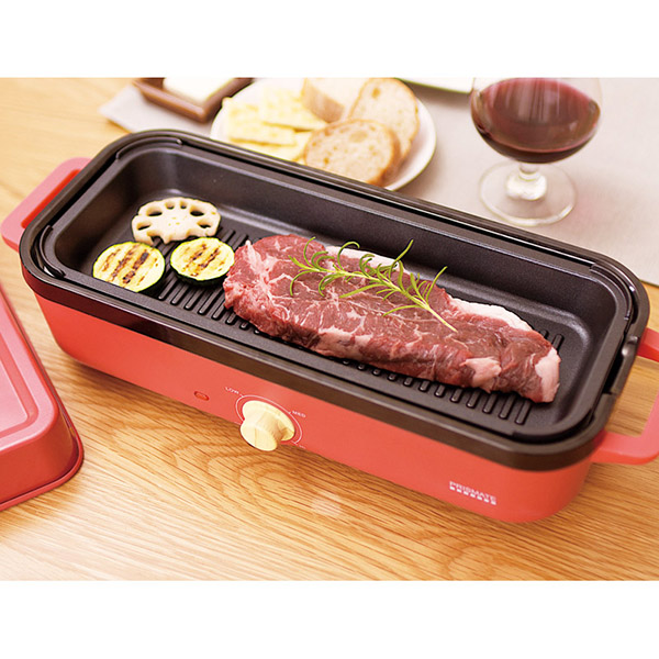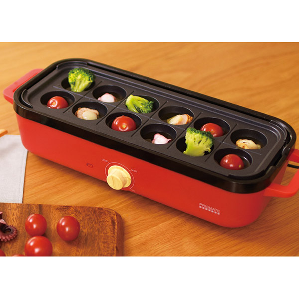 5つすべてのパーツがスタッキング可能で場所をとりません。ダイヤル式の無段階温度調節が可能。ホームパーティーなどにおすすめです。フラット、グリル、たこ焼きの3種類のプレート付。