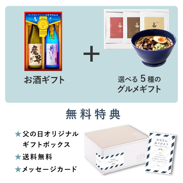 お父さんが貰って嬉しい人気のお酒と、だし茶漬けやラーメンなどから好みに合わせて選べるグルメを贈る、とっておきの父の日ギフトセットです!父の日専用メッセージカードを添えて、ギフトと一緒に「ありがとう」の気持ちを贈りましょう。