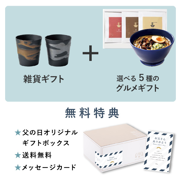 お父さんが貰って嬉しいプレゼントを厳選!普段使いしやすい人気のギフトと、ラーメン・おつまみなどの選べるグルメギフト、そしてオリジナルのメッセージカードをセットにした父の日限定のギフトです。
