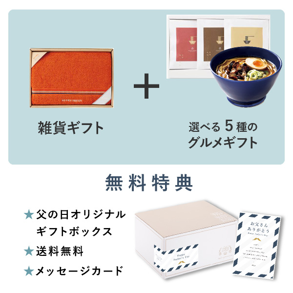 お父さんが貰って嬉しいプレゼントを厳選!普段使いしやすい人気のギフトと、ラーメン・おつまみなどの選べるグルメギフト、そしてオリジナルのメッセージカードをセットにした父の日限定のギフトです。