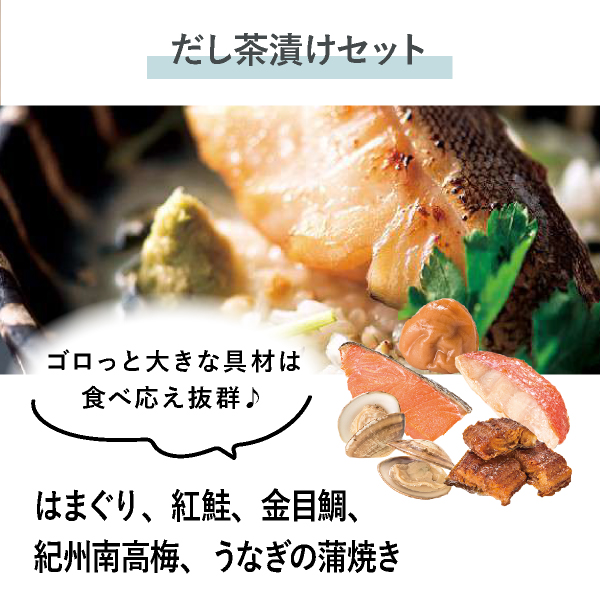 | 内容 | だし茶漬けの素4.5g×5、はまぐり2個×1、紅鮭1切×1、金目鯛1切×1、紀州南高梅1粒×1、うなぎの蒲焼き15g×1、白煎りごま1g×5 |