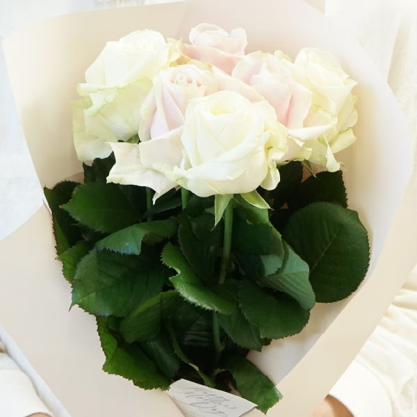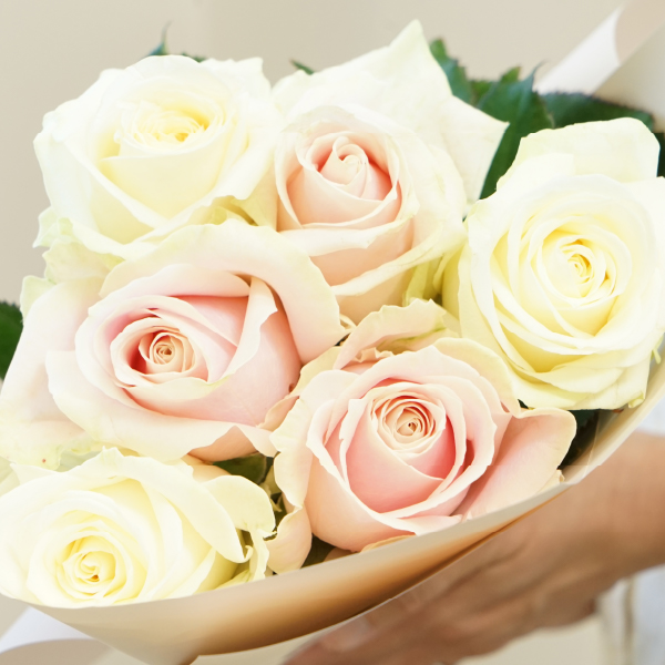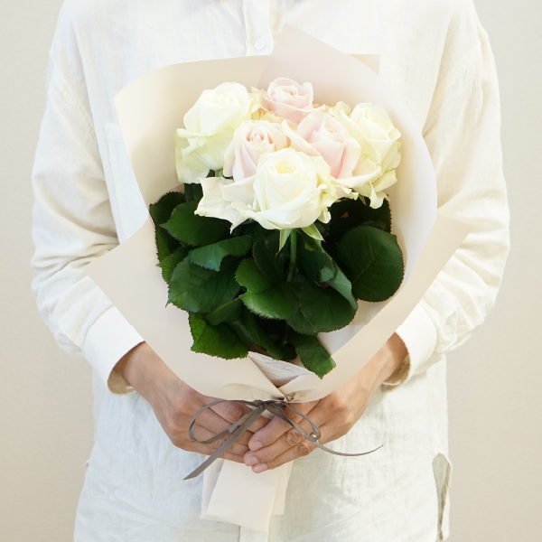 美しい白さが印象的なアヴァランチェ+や、ロマンティックな淡いピンク色のスイートアヴァランチェ+を組み合わせた、優雅な雰囲気の花束です。