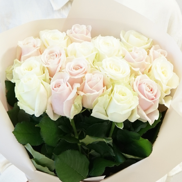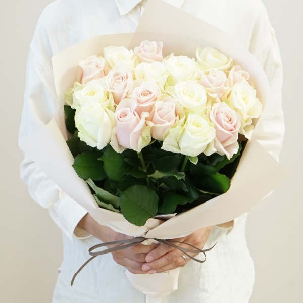 美しい白さが印象的なアヴァランチェ+や、ロマンティックな淡いピンク色のスイートアヴァランチェ+を組み合わせた、優雅な雰囲気の花束です。