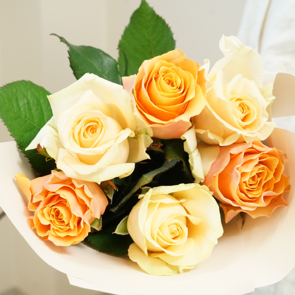 6本の薔薇の花言葉は「互いに敬い愛し、分かち合う」。「絆」や「信頼」といった友人や家族へのプレゼントに適した花言葉が多いオレンジ色の花束。大切な方へ、気持ちを込めて贈るのにぴったりです。