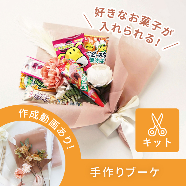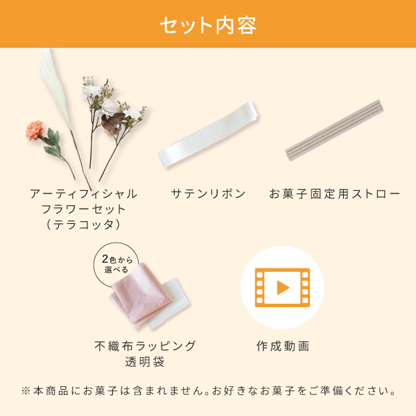| 内容 | 【ブーケキット】 ・アーティフィシャルフラワーセット(テラコッタ系)×1 ・不織布ラッピング(約65×65cm)×1 ※2色からお好きなものをお選びいただけます。 ・サテンリボン アイボリー(幅3.8×長さ10cm)×1 ・透明袋×1 ・お菓子固定用ストロー×8 ※こちらの商品にお菓子は含まれません。お好きなお菓子でアレンジをお楽しみください。 【製作時ご用意いただくもの】 ・麻ひも(輪ゴムで代用も可) ・テープ(マスキングテープも可) ・ニッパー(花材を切るため) 【あると便利なもの】 ・ホチキス(ラッピングを留めるため) ・マスキングテープ (セロテープの上に貼って可愛くするため) 【作り方】 作成動画を見る |