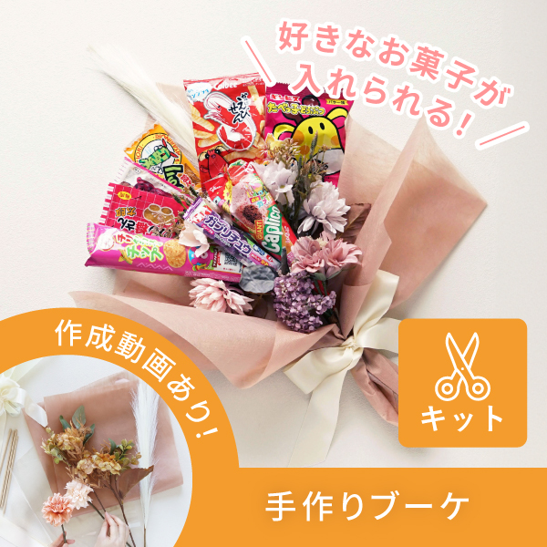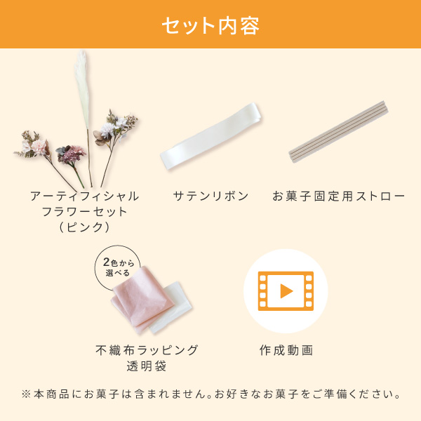 | 内容 | 【ブーケキット】 ・アーティフィシャルフラワーセット(ピンク系)×1 ・不織布ラッピング(約65×65cm)×1 ※2色からお好きなものをお選びいただけます。 ・サテンリボン アイボリー(幅3.8×長さ10cm)×1 ・透明袋×1 ・お菓子固定用ストロー×8 ※こちらの商品にお菓子は含まれません。お好きなお菓子でアレンジをお楽しみください。 【製作時ご用意いただくもの】 ・麻ひも(輪ゴムで代用も可) ・テープ(マスキングテープも可) ・ニッパー(花材を切るため) 【あると便利なもの】 ・ホチキス(ラッピングを留めるため) ・マスキングテープ (セロテープの上に貼って可愛くするため) 【作り方】 作成動画を見る |