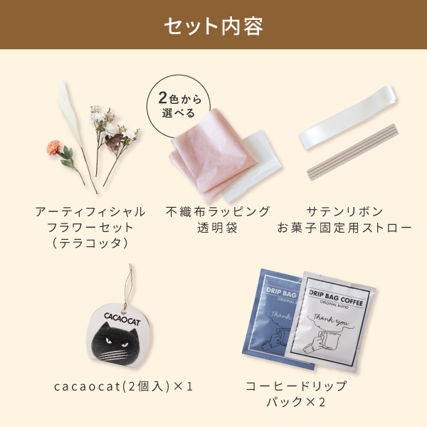 | 内容 | 【お菓子】 ・選べるチョコAコース(CACAOCAT 2個入り)×1個 ・選べるコーヒーAコース(コーヒードリップパック)×2枚 【ブーケキット】 ・アーティフィシャルフラワーセット(テラコッタ系)×1 ・不織布ラッピング(約65×65cm)×1 ※2色からお好きなものをお選びいただけます。 ・サテンリボン アイボリー(幅3.8×長さ10cm)×1 ・透明袋×1 ・お菓子固定用ストロー×8 【製作時ご用意いただくもの】 ・麻ひも(輪ゴムで代用も可) ・テープ(マスキングテープも可) ・ニッパー(花材を切るため) 【あると便利なもの】 ・ホチキス(ラッピングを留めるため) ・マスキングテープ (セロテープの上に貼って可愛くするため) 【作り方】 作成動画を見る |