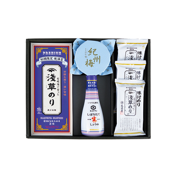 | 内容 | 浅草焼のり(半切5枚)・紀州南高梅100g・キッコーマンしぼりたて生しょうゆ200ml×各1、浅草味付けのり(8切8枚)×3 |