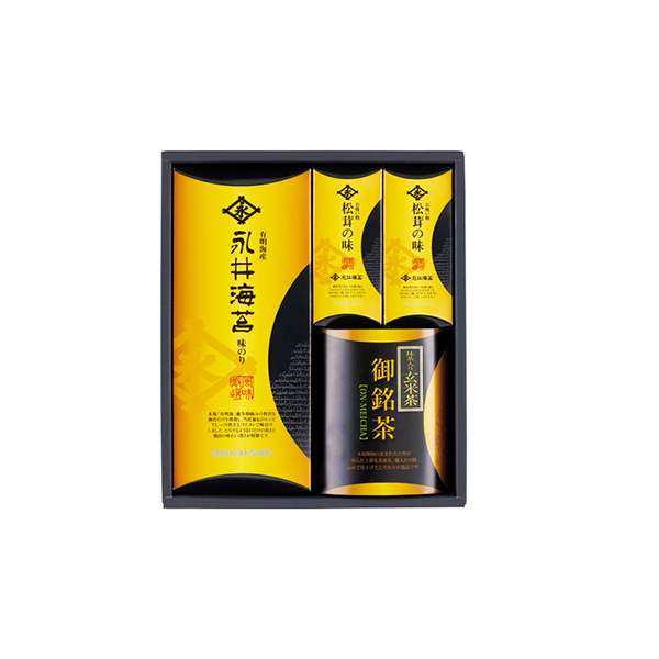 毎日の食卓にあると嬉しい、味海苔、松茸風味のお吸い物、旨味を引き出した玄米茶を組み合わせたセット。上品で落ち着いたデザインのパッケージは、年代や性別を問わず贈りやすく、さまざまなご用途のギフトにおすすめです。