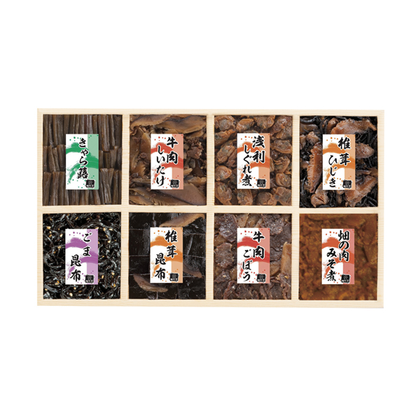 | 内容 | きゃら蕗60g・牛肉しいたけ50g・浅利しぐれ煮50g・椎茸ひじき50g・ごま昆布60g・椎茸昆布60g・牛肉ごぼう50g・畑の肉みそ煮50g×各1 |