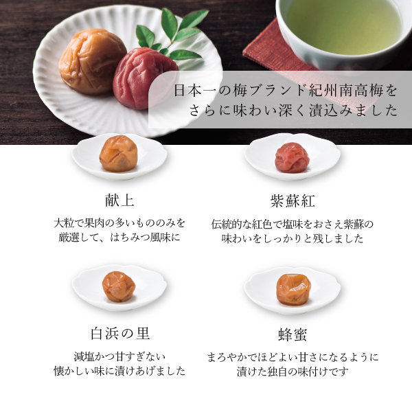 | 内容 | 献上 紀州南高梅17g×2、蜂蜜 紀州南高梅7g×2、紫蘇紅 紀州南高梅7g×2、白浜の里 紀州南高梅7g×2、鹿児島県産 かぶせ茶ティーバッグ2g×10、静岡県牧之原産 深むし茶ティーバッグ2g×10、静岡県産 煎茶ティーバッグ2g×10 |