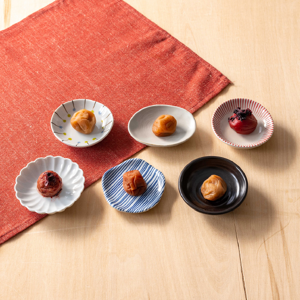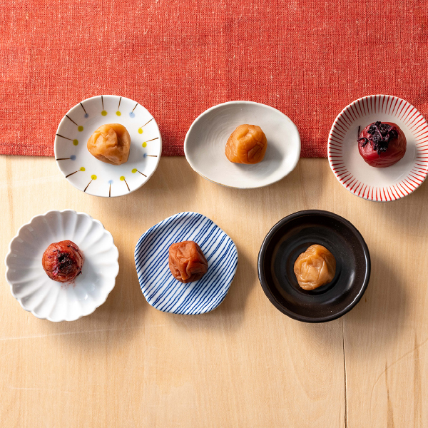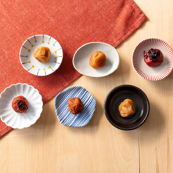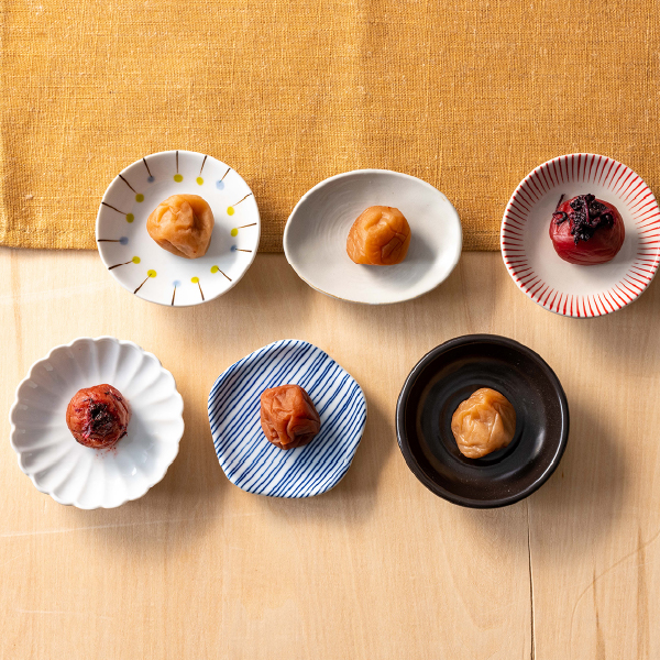 紀州南高梅の6種類の味を取り揃えました。うす塩味(塩分約6%)から白干梅(塩分約20%)まで、少しずつ違った味をお楽しみください。