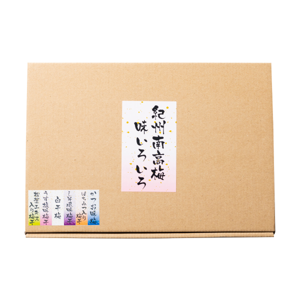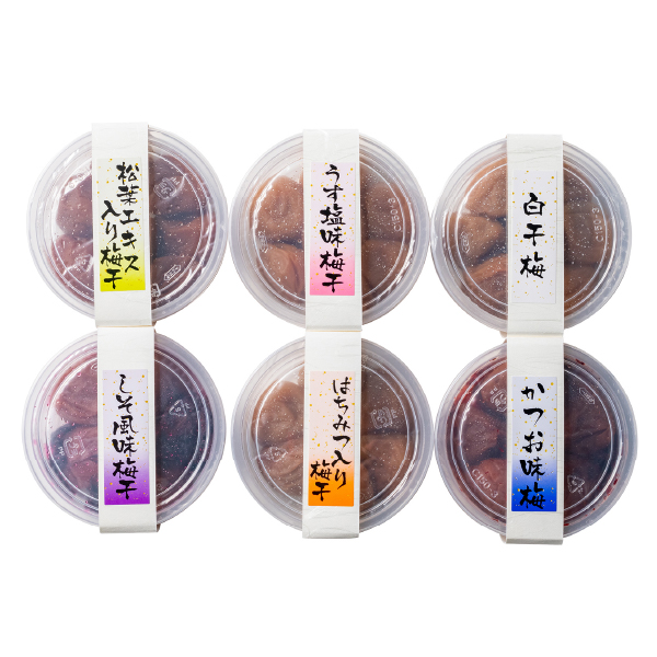 | 内容 | 松葉エキス入り梅干(塩分約14%)・うす塩味梅干(塩分約6%)・白干梅(塩分約20%)・しそ風味梅干(塩分約8%)・はちみつ入り梅干(塩分約8%)・かつお味梅(塩分約14%) 各80g |