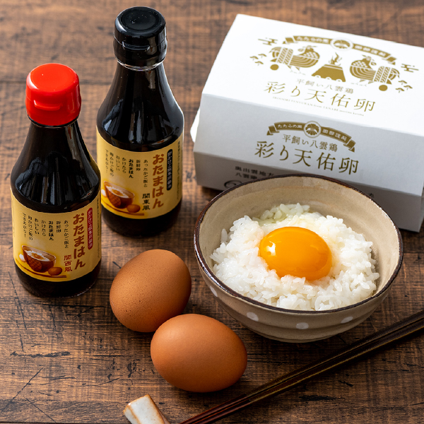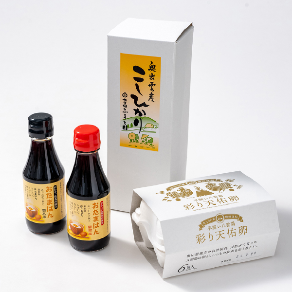 | 内容 | 奥出雲吉田町産こしひかりkg、平飼い八雲鶏彩り天佑卵6個、おたまはん関東風・おたまはん関西風 各150ml |