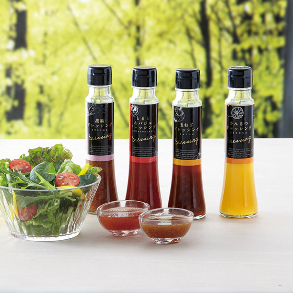 | 内容 | しょうがドレッシング(100ml)・胡麻ドレッシング(100ml)・とまと&バジルドレッシング(100ml)・玉ねぎドレッシング(100ml)・ひまわり油(90g)×各1 |