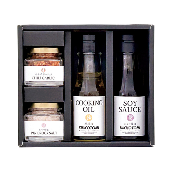 | 内容 | 唐辛子ガーリック(20g)・ピンク岩塩(45g)・クッキングオイル(60g)・たまり醤油(70ml)×各1 |