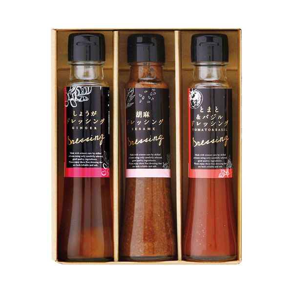 | 内容 | しょうがドレッシング(100ml)・胡麻ドレッシング(100ml)・とまと&バジルドレッシング(100ml)×各1 |