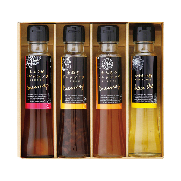 | 内容 | しょうがドレッシング(100ml)・玉ねぎドレッシング(100ml)・かんきつドレッシング(100ml)・ひまわり油(90g)×各1 |
