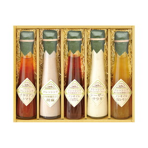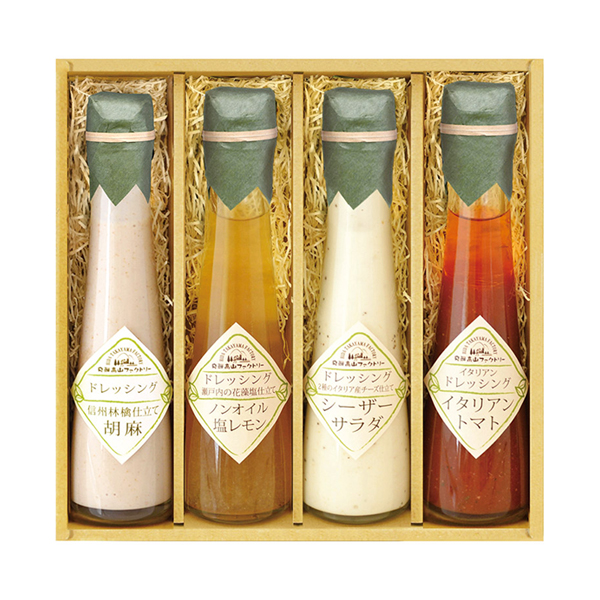 | 内容 | 信州林檎仕立て胡麻ドレッシング(120ml)・2種のイタリア産チーズ仕立てシーザーサラダドレッシング(120ml)・瀬戸内の花藻塩仕立てノンオイル塩レモンドレッシング(120ml)・イタリアントマトのイタリアンドレッシング(120ml)×各1 |