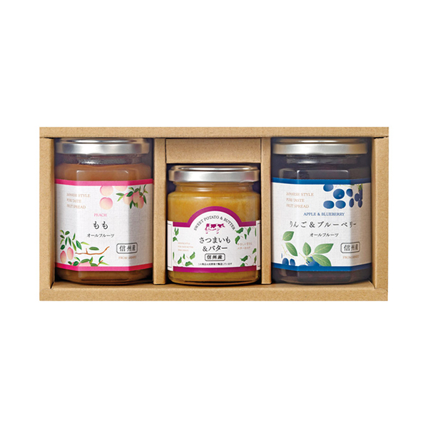 | 内容 | ももスプレッド(140g)・りんご&ブルーベリースプレッド(140g)・さつまいも&バターペースト(110g)×各1 |
