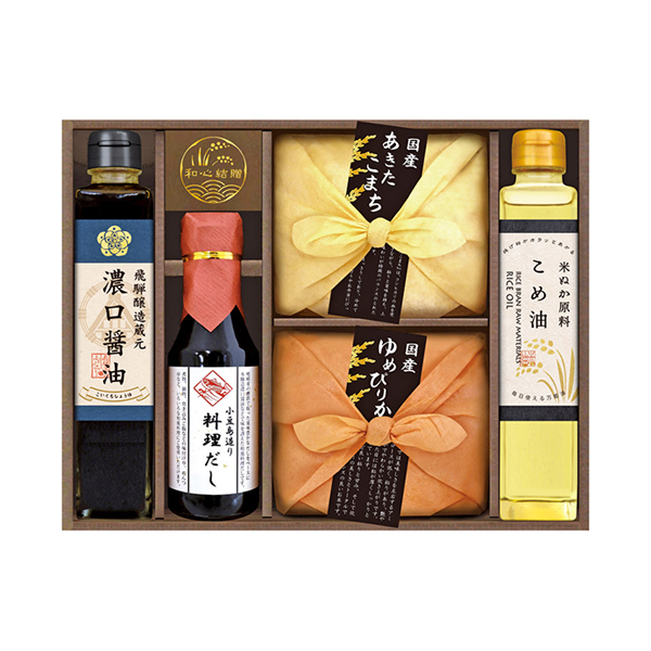 小豆島でつくる料理だしや、飛騨高山の蔵元がつくるお醤油などこだわりの調味料と、「あきたこまち」・「ゆめぴりか」のお米をセットにしました。愛される日本の食を贈るギフトは、お祝いのお返しや快気祝いなどのシーンにおすすめです。