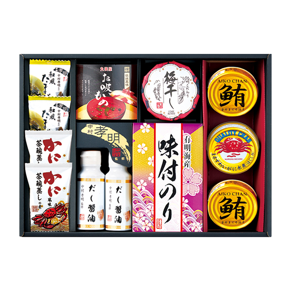 | 内容 | 中村孝明監修(だし醤油100ml・たまごすーぷ)・かに風味茶碗蒸しの素(2食分)・鮪油漬フレーク70g×各2、味付のり(8切8枚×2)・お吸いもの(2.5g×5)・まるずわいがにほぐしみ55g・紀州梅干し70g×各1 |