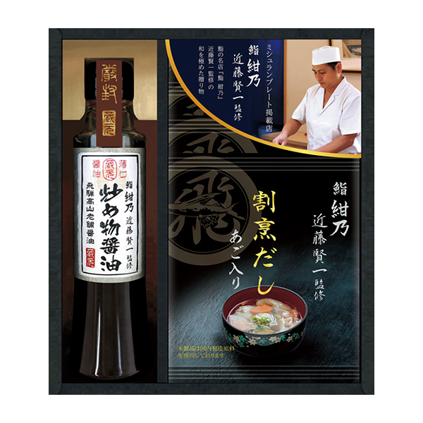 | 内容 | 鮨 紺乃 近藤賢一監修 あご入り割烹だしパック8g×4、鮨 紺乃 近藤賢一監修 飛騨高山炒め物醤油200ml×1 |