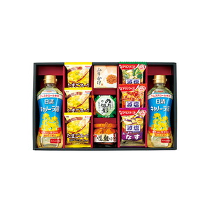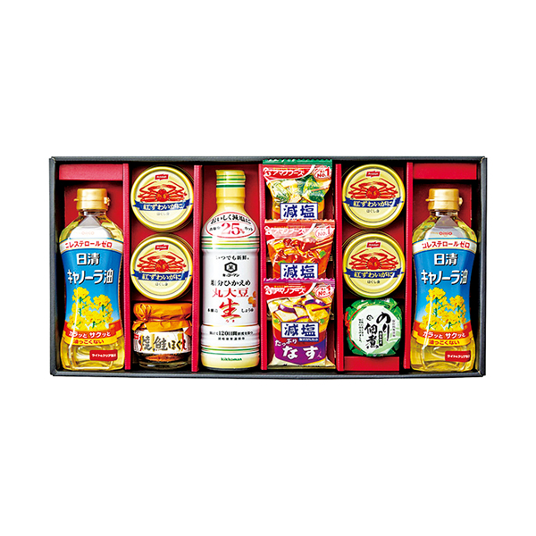 | 内容 | 日清キャノーラ油350g×2、キッコーマン塩分ひかえめ丸大豆生しょうゆ450ml・アマノフーズ減塩いつものおみそ汁(なす・なめこ・ほうれん草)・ニッスイ焼鮭ほぐし50g・島の香 のり佃煮80g×各1、ニッスイ紅ずわいがにほぐし身55g×4 |