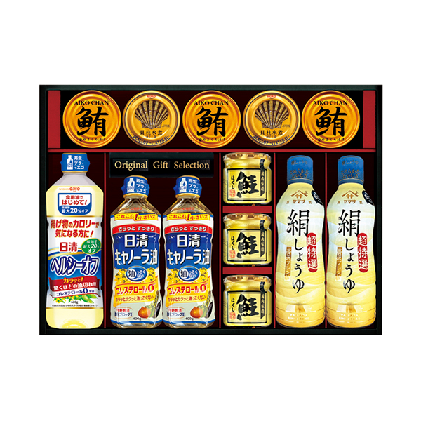 | 内容 | ヤマサ絹しょうゆ450ml・日清キャノーラ油400g・宝幸貝柱水煮ほぐし身65g(固形量35g)×各2、鮭ほぐし50g・まぐろ油漬け70g×各3、日清ヘルシーオフ600g×1 |