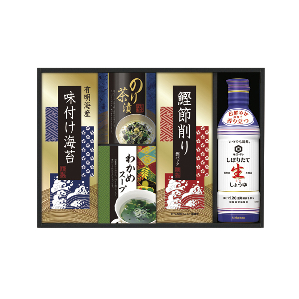 | 内容 | キッコーマンしぼりたて生しょうゆ450ml・有明海産味付け海苔(3切4枚)・のり茶漬け(4.3g×2)・わかめスープ(5.3g×2)・鰹節削り(2g×4)×各1 |